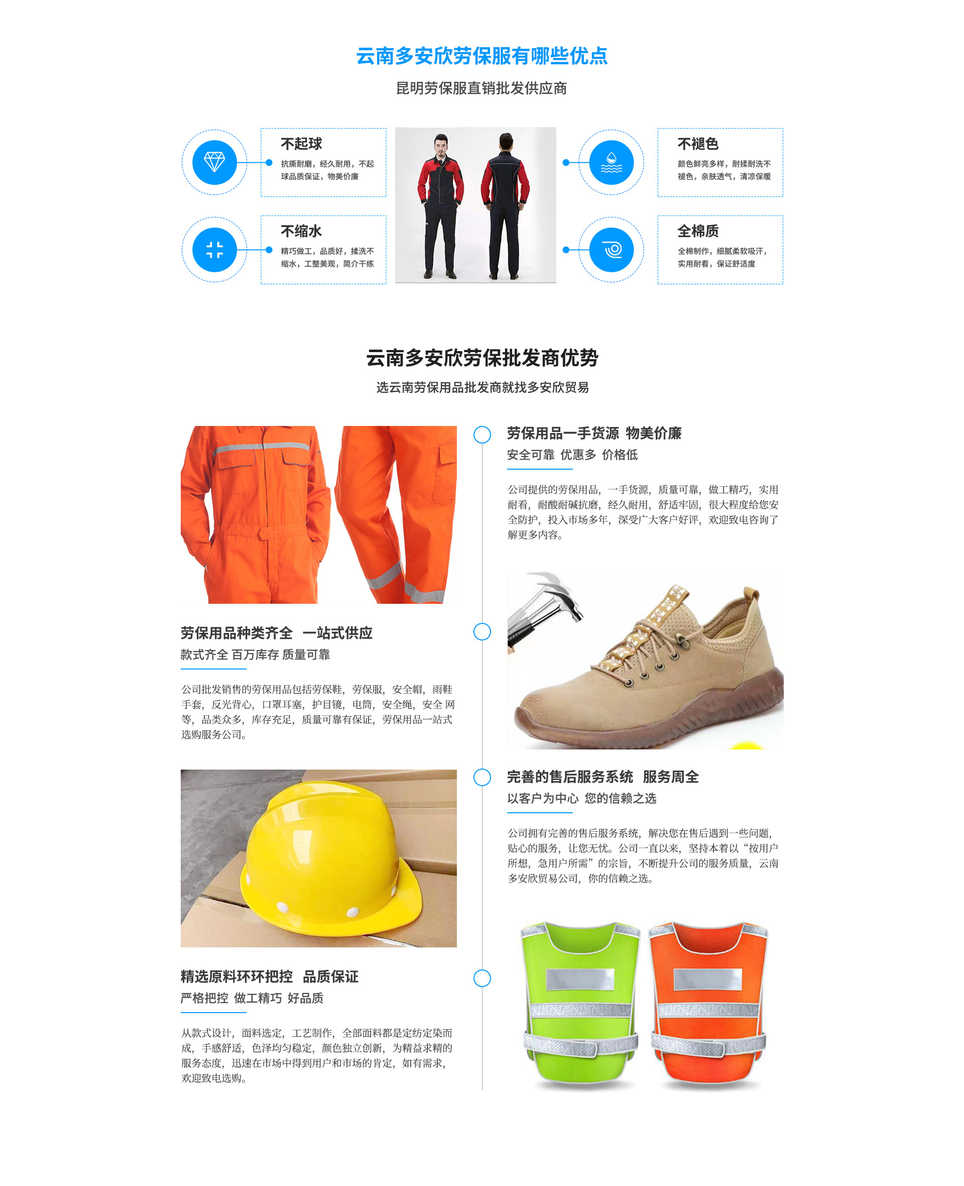 云南多安欣貿(mào)易有限公司位于云南省昆明市官渡區(qū)昌宏路東聚五金建材市場東區(qū)10-10。云南多安欣貿(mào)易有限公司是一家集生產(chǎn)。銷售、批發(fā)為一體的大型勞保用品單位。公司成立18年有余,在這18年里我們憑借我們行業(yè)知識,認真的態(tài)度和售后服務,在云南市場迅速崛起,同時代理銷售國內(nèi)外各優(yōu)良廠商(普通、特種)勞動防護用品。安全防護用品,公司現(xiàn)有員工15人,公司一直以來,堅持本著以“按用戶所想,急用戶所需”的宗旨,從款式設計,面料選定,工藝制作,為精益求精的服務態(tài)度,迅速在市場中得到用戶和市場的肯定,公司經(jīng)營品種達到一萬余種,包含了勞保用品的各個系列,如定制工裝、頭部防護,呼吸防護,勞保鞋,電力物資雨衣類眼臉部位防護,3m系列,墜落安全防護,交通安全設施電筒類多功能防護服、防塵防毒。耐酸堿。耐油,耐高溫,防寒,阻燃,隔熱,氣體監(jiān)測,絕緣防靜電,防砸高空墜落,救護,逃生,等特種勞保用品,如(彩條布,吊帶軟梯噸袋安全帽,...